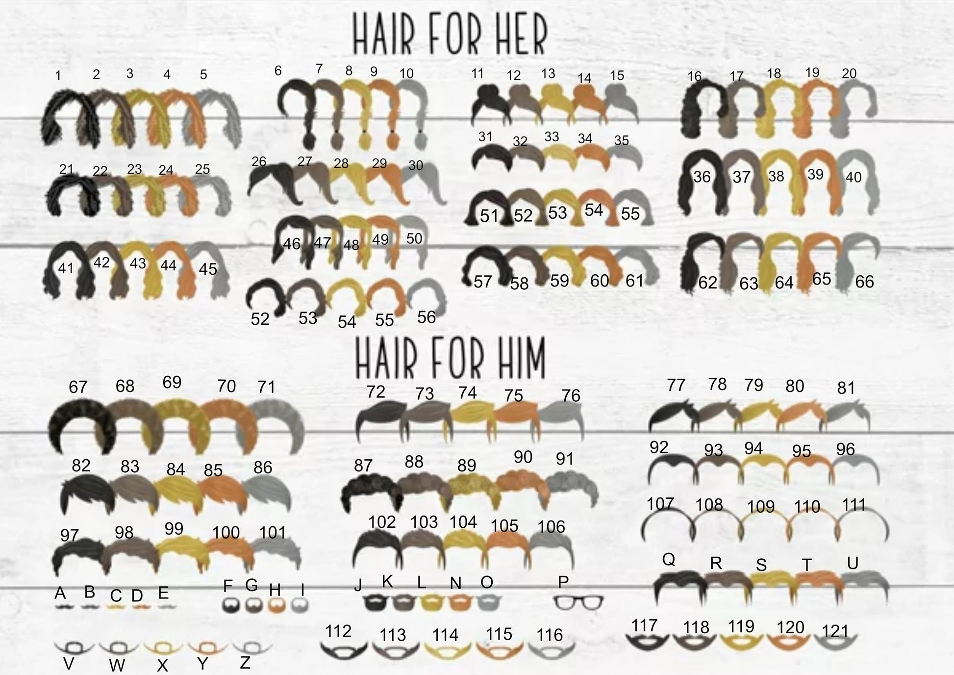 3) From the hair photo, choose your numbers for your hairstyles and any facial hair.