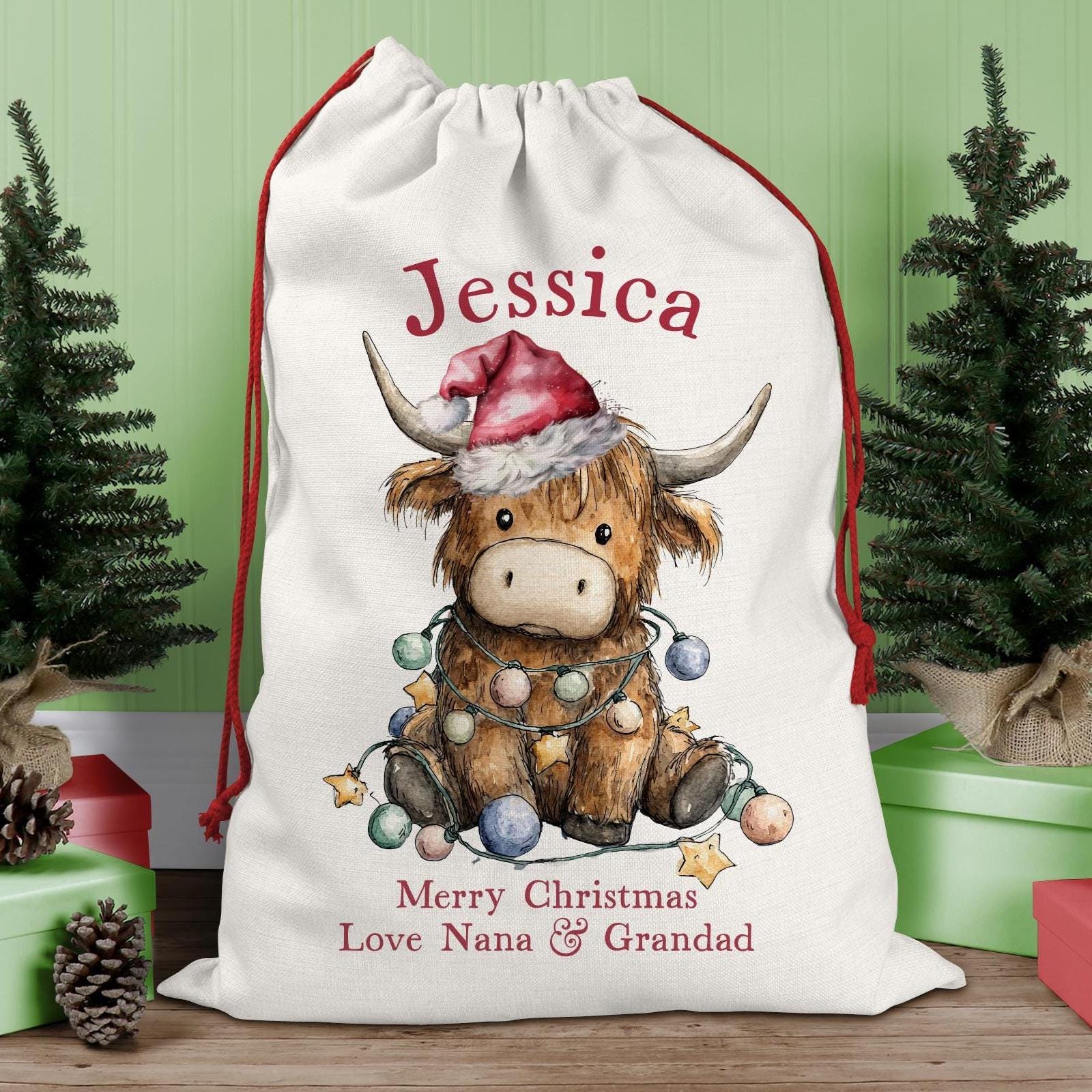 Customised Large Linen Santa Sack with a Christmas Highland Cow