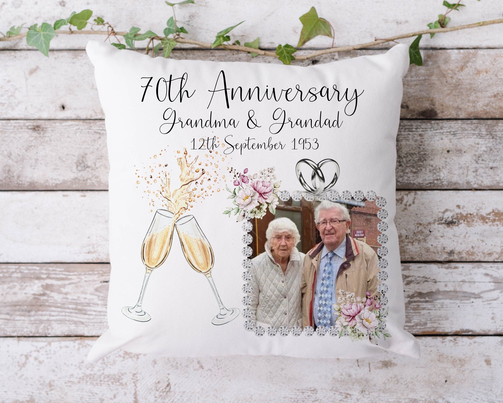 This beautiful cushion makes a very special gift for a couple who have reached the amazing Platinum milestone of 70 years married! Include a special picture of the couple and include their names and date of marriage. The design includes platinum rings and peonies which symbolise the 70 year anniversary. Printed onto a soft, velvet feel, light cream cushion cover and stuffed with a plush inner. It measures 40 x 40 cm and comes in a presentation bag, perfect for gift giving.