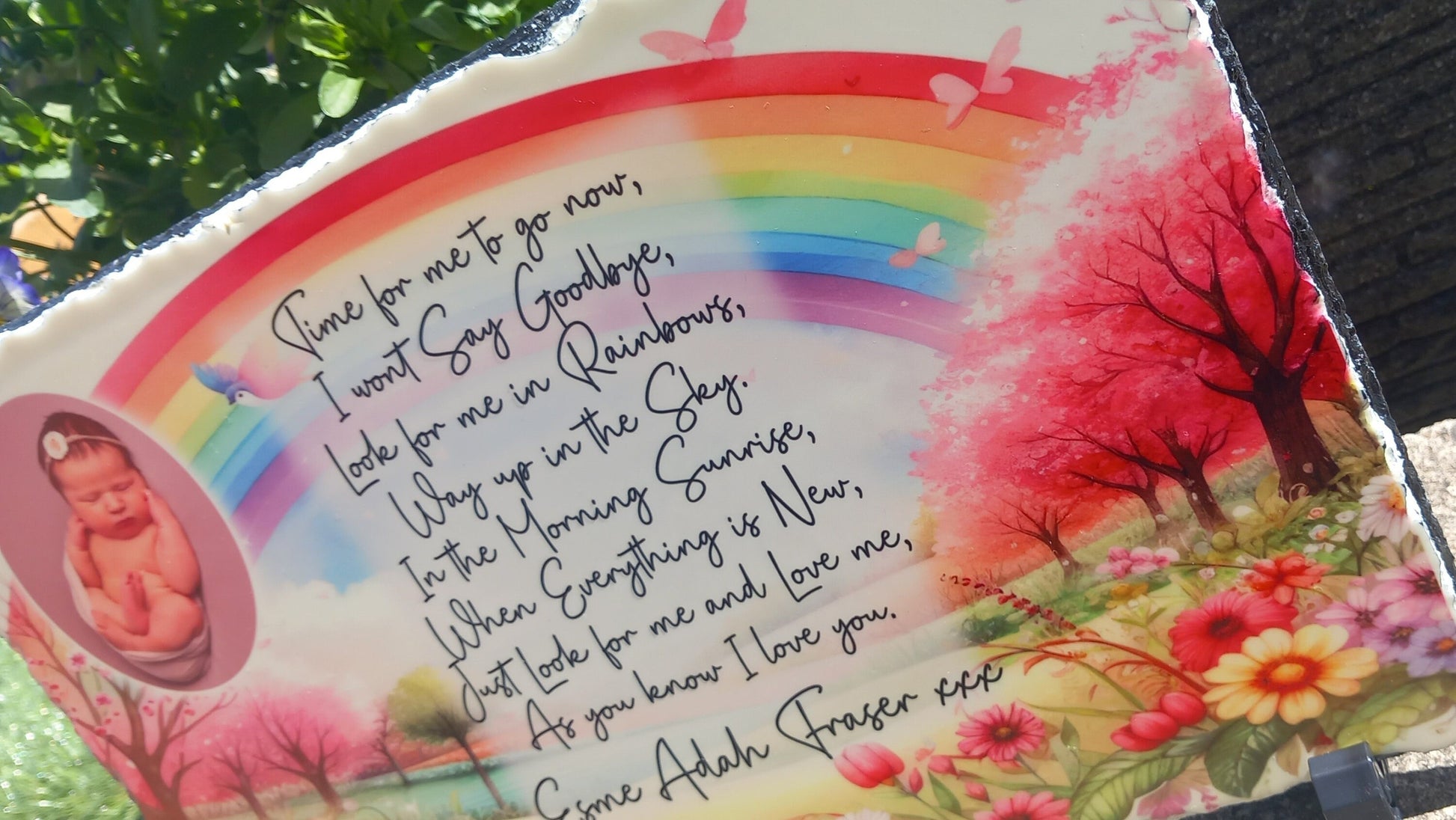 Honor the memory of a precious little one with our Personalised Baby Loss Memorial Slate. The 30 x 20 cm slate comes with a stand and features a beautiful rainbow background, sweet words, and the option to add a photo of the baby. This thoughtful gift will provide comfort and support to someone who has experienced the loss of a child and serves as a lasting tribute to their memory. You can also personalise the slate by adding the baby's name at the end of the poem, making it a truly personal and touching keepsake. Remember, the loss of a little one is such an upsetting time, and this memorial slate is a beautiful way of reminding someone of their little one who has been lost but not forgotten. It can be used at their resting place but it is recommended to spray it with UV spray to protect it from fading in the sun's rays. The print is permanent so it won't come off in the rain. If you would like to supply a photo, please send it to us after purchase and ensure that it is a clear, bright photo.